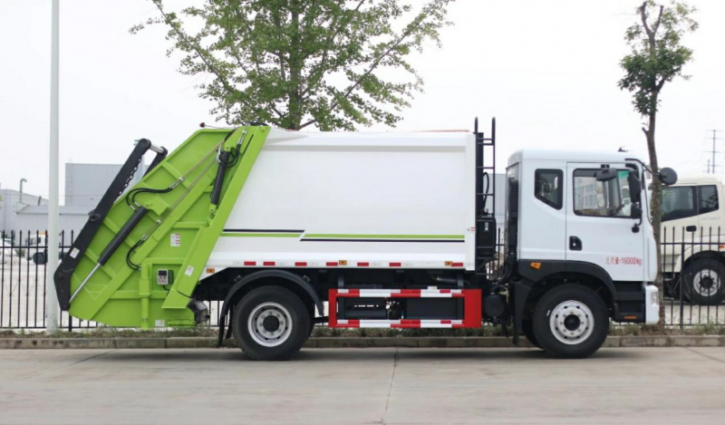 ④ 密封處理消除二次污染 垃圾在壓縮裝填和運輸過程中處于封閉狀态。垃圾箱與填裝器接合面裝有特制的橡膠密封條,采用鎖緊裝置壓縮密封;污水箱上安裝有獨特的排污閥,密封可靠,不易堵塞。填裝器蓋選裝完全遮蓋住填裝器投料口,消除轉運過程車尾氣流擾動造成垃圾塵屑飛揚的現象,外觀更加美觀。